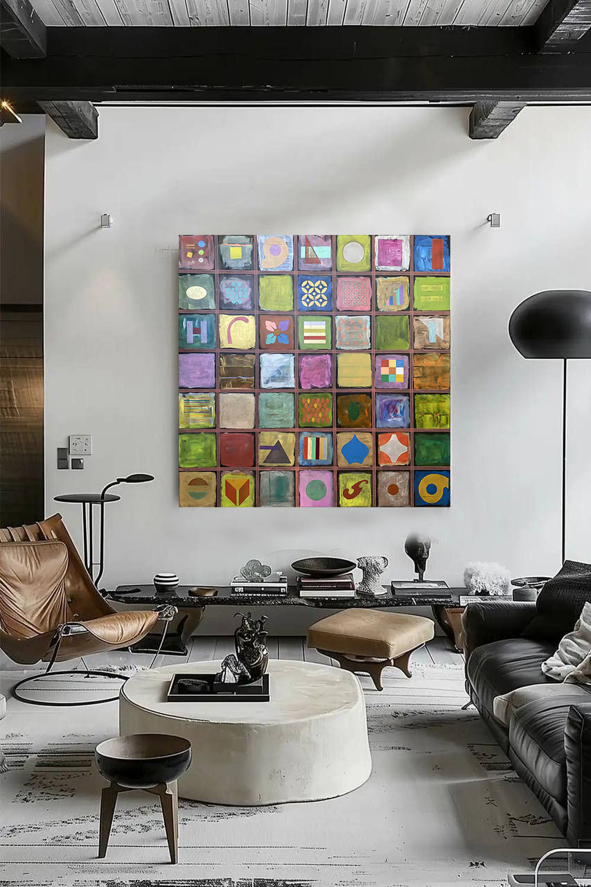 This underlying order holds together all fragments, colors and symbols, giving the work a quiet clarity even when the surface is complex. - Geometry