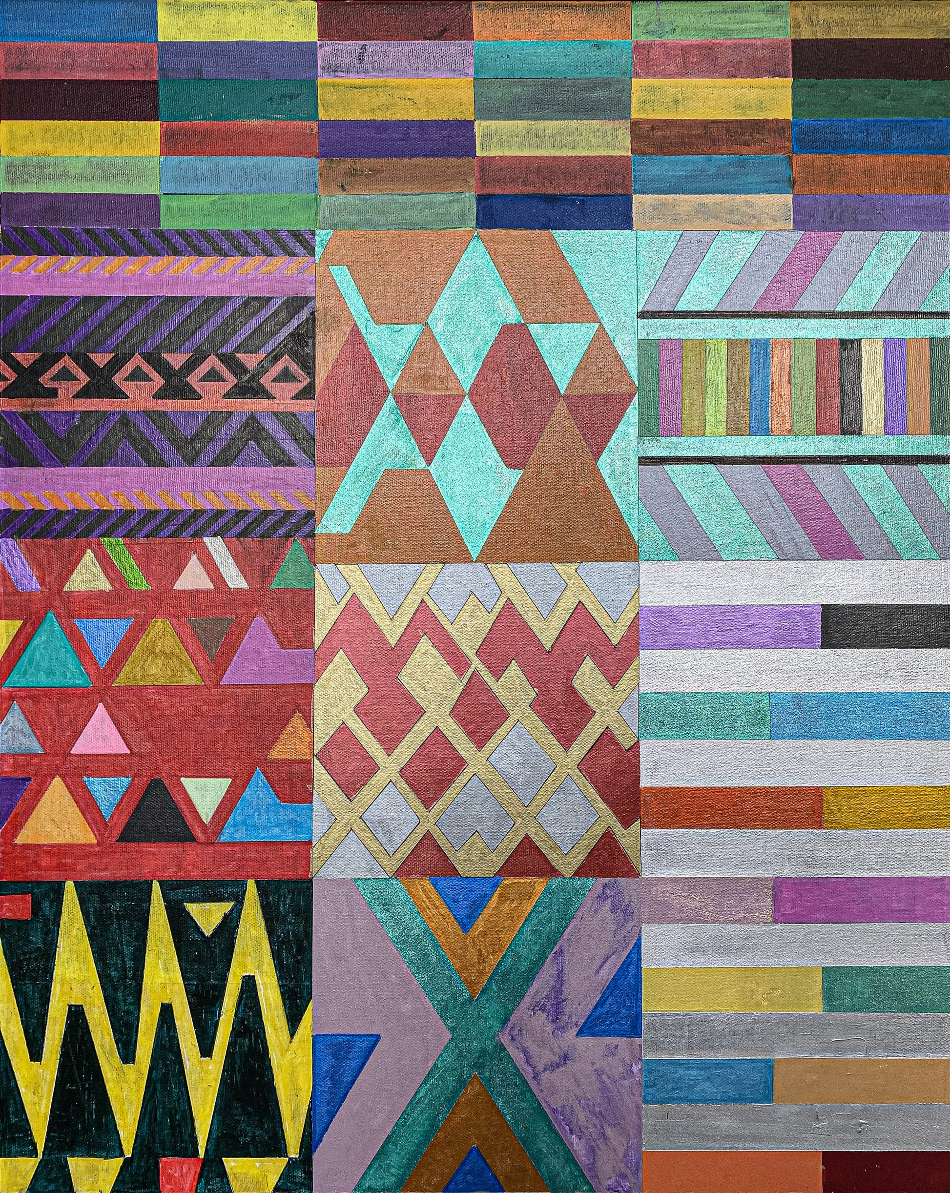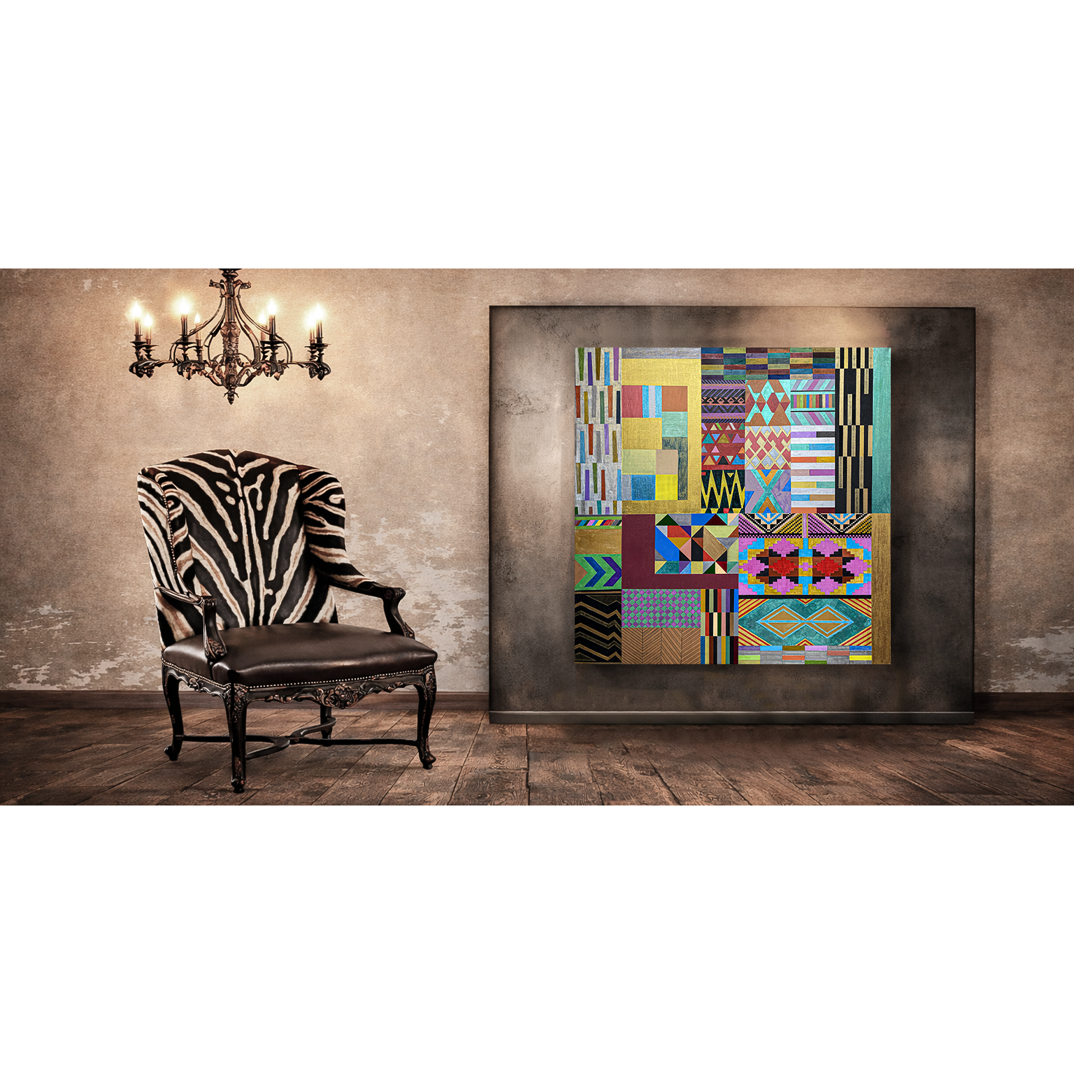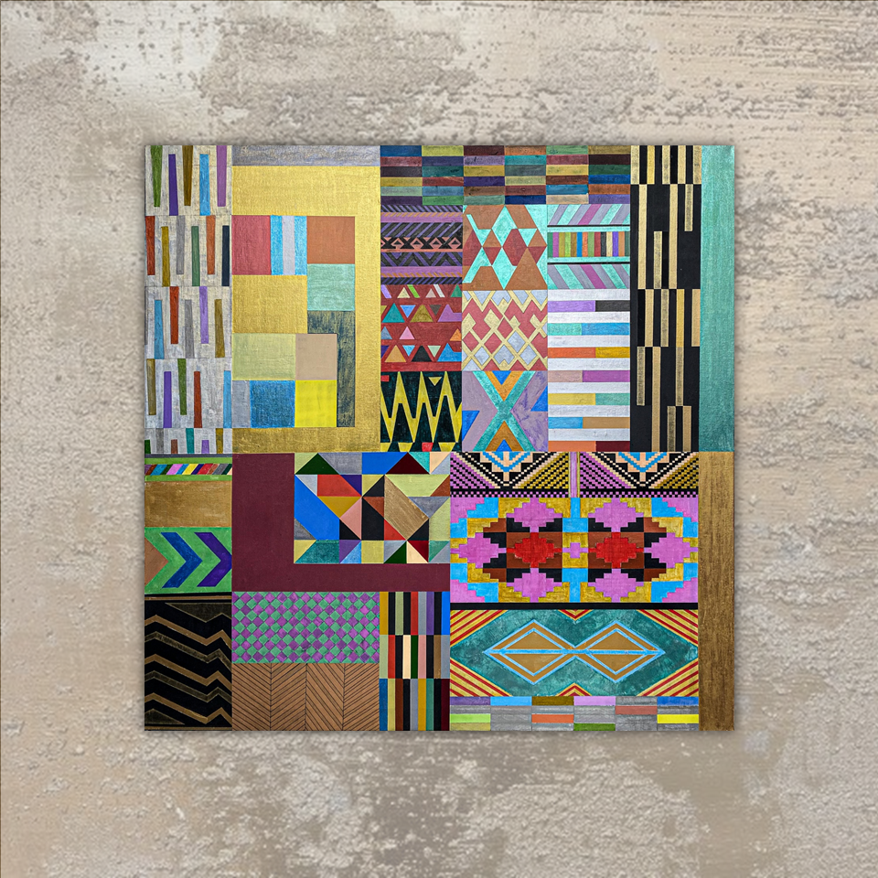 A mosaic of fragments—textile codes, architectural stripes, and chromatic tiles—assembled into a disciplined grid. The work carries the spirit of ornament without becoming decorative; it builds a contemporary language where East–West visual traditions meet under a modernist order.In this composition, Venice is not depicted—it is translated: light becomes color blocks, streets become stripes, and historic surfaces become a quiet geometry you can live with.