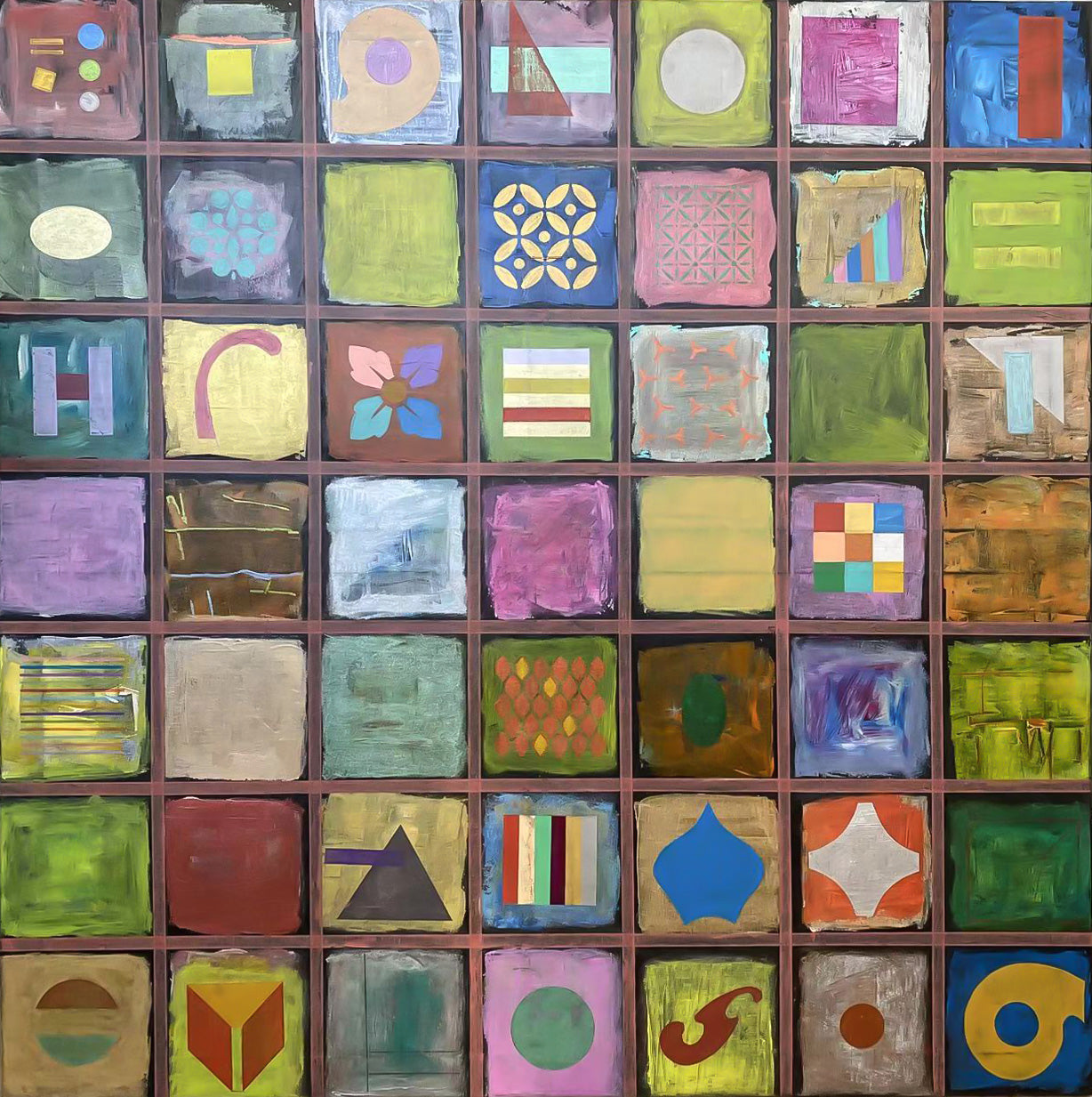 A calm but complex composition built from layered colour fields and small symbolic units. Part of the “Archive of Fragments” series, this painting gathers memories and signs into a quiet grid – each square holding a different mood, texture or story.The work reflects PELLESCURA’s architectural approach to painting: structure first, then emotion. Geometry, colour and surface are used as containers for identity and time, rather than as decoration.