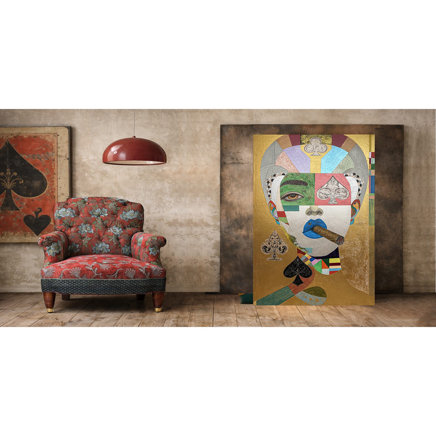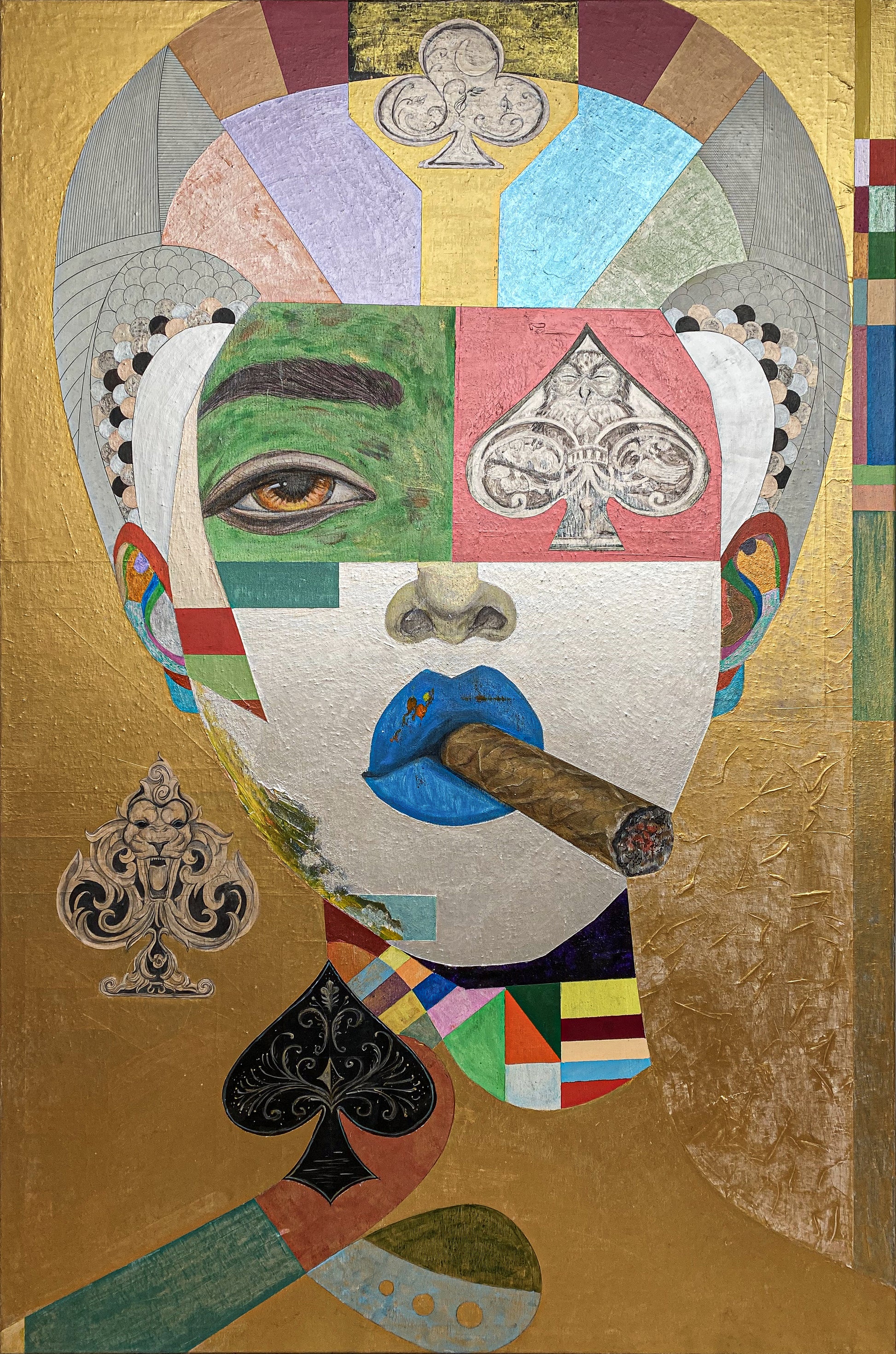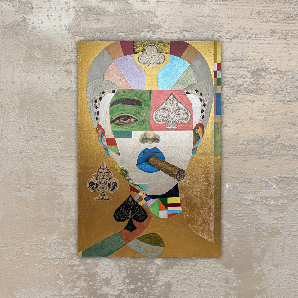 This portrait treats identity as strategy—an arrangement of signs, probabilities, and deliberate concealments. Against gold, the figure reads like an icon of appetite, discipline, and risk : a calm face built from coded fragments, where desire and control negotiate in public.