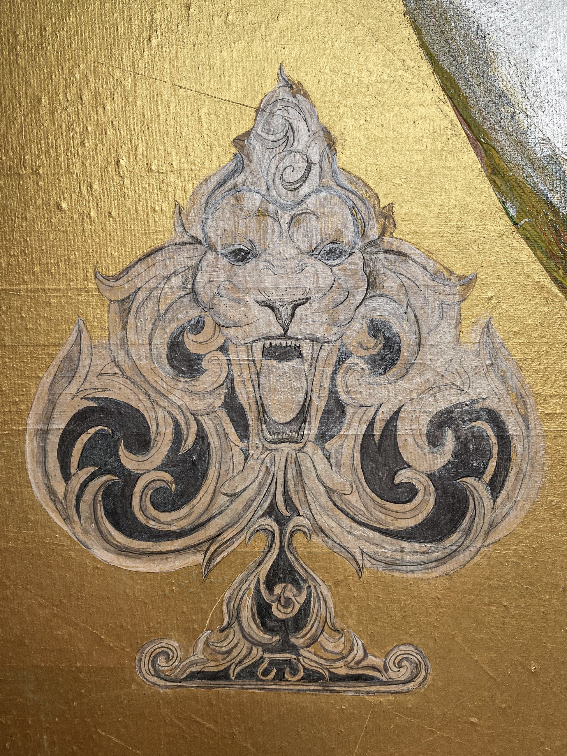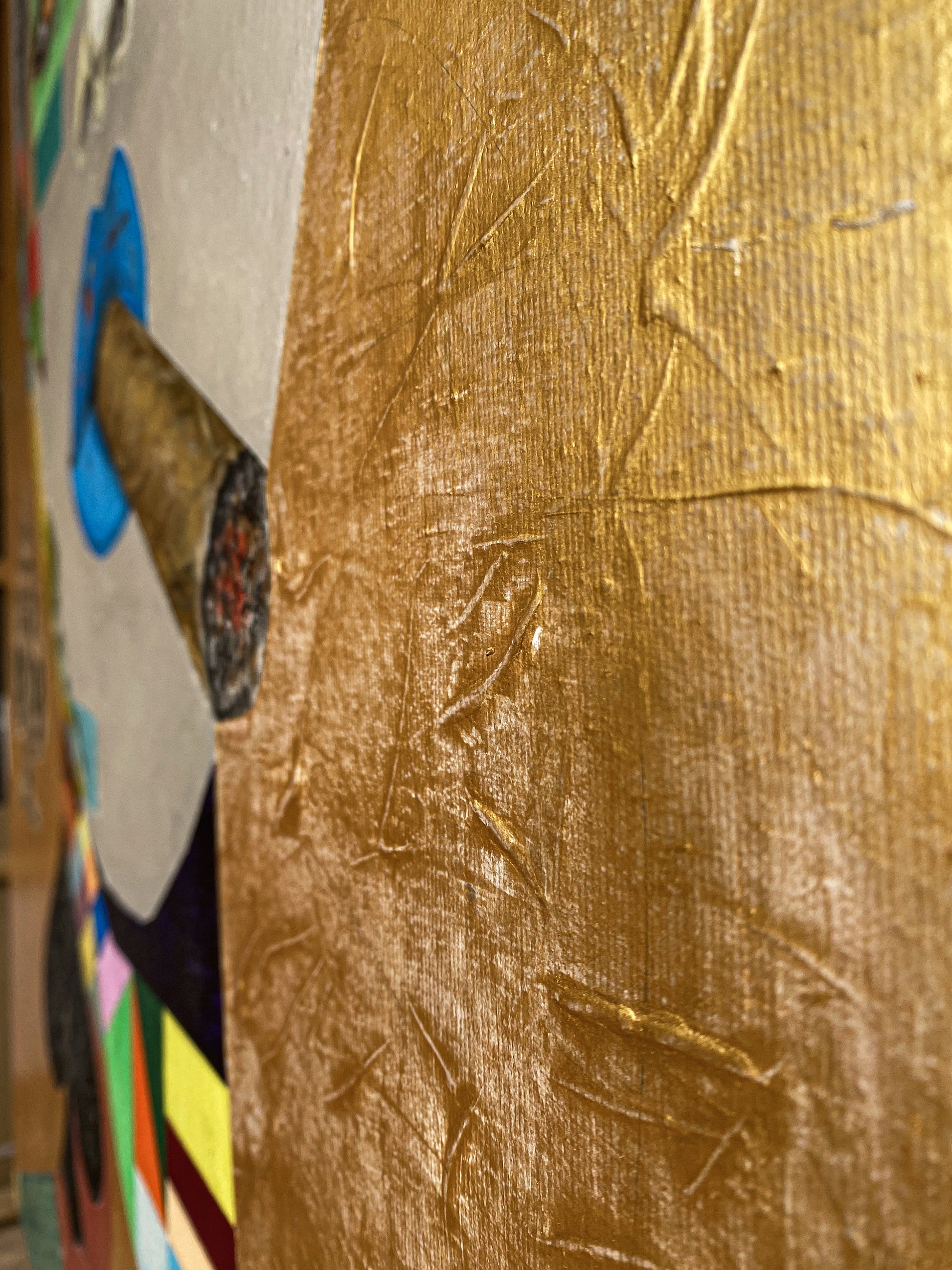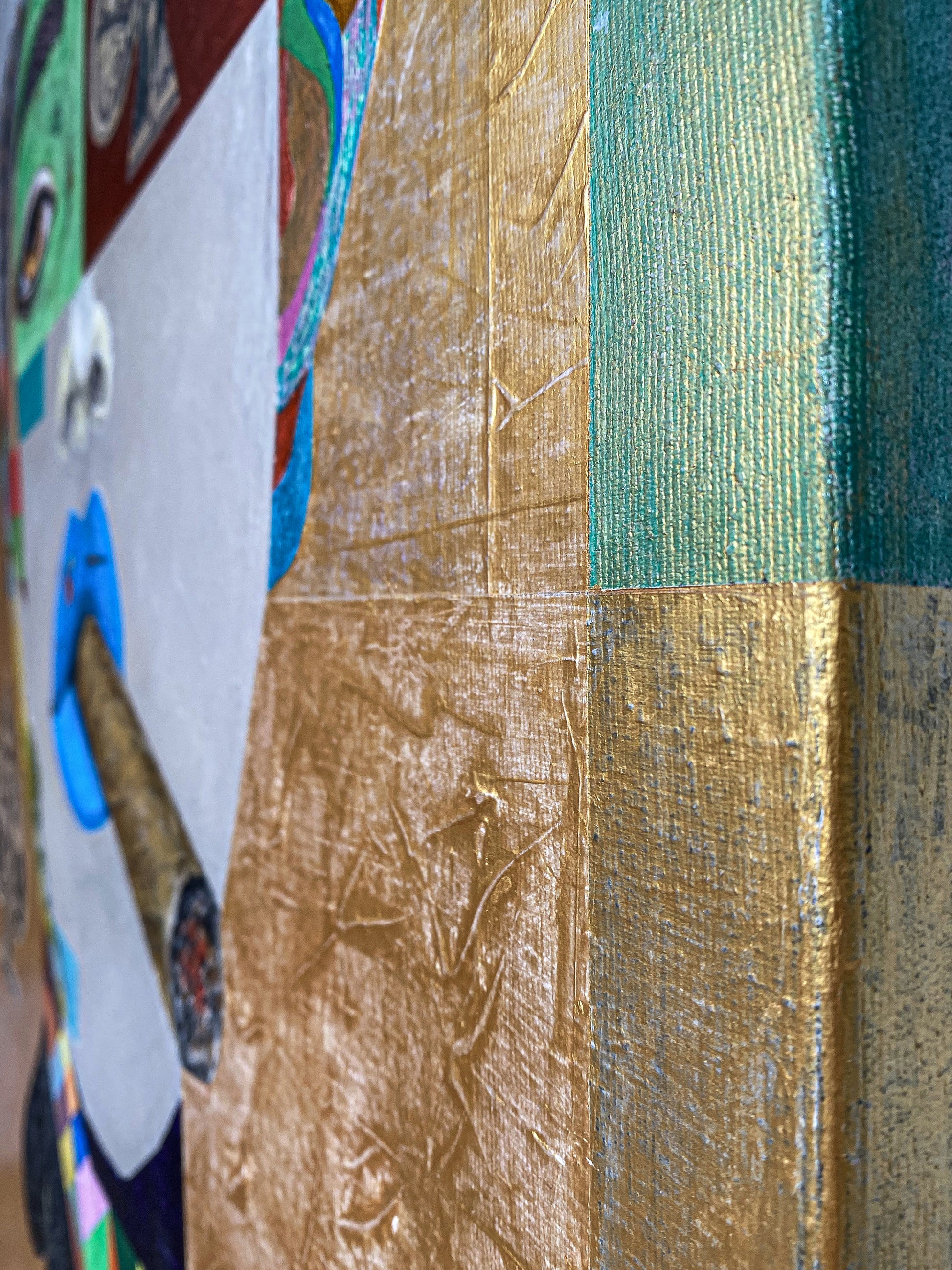 To create an authentic vintage presence—distinct from any print—we build a plaster-like ground and work through controlled pigment mixing. The base breaks the flat canvas plane, producing patina, depth, and tactile relief.