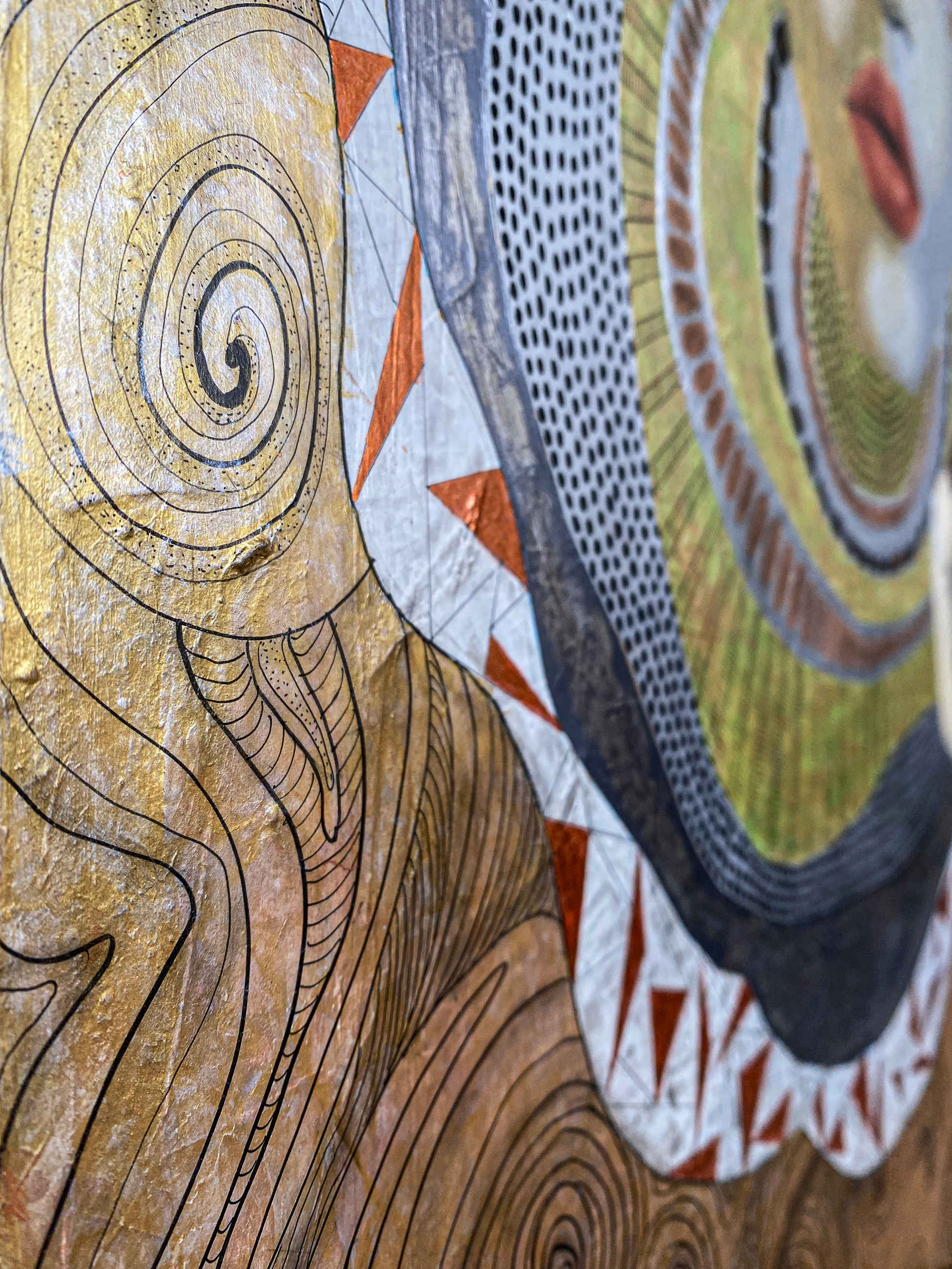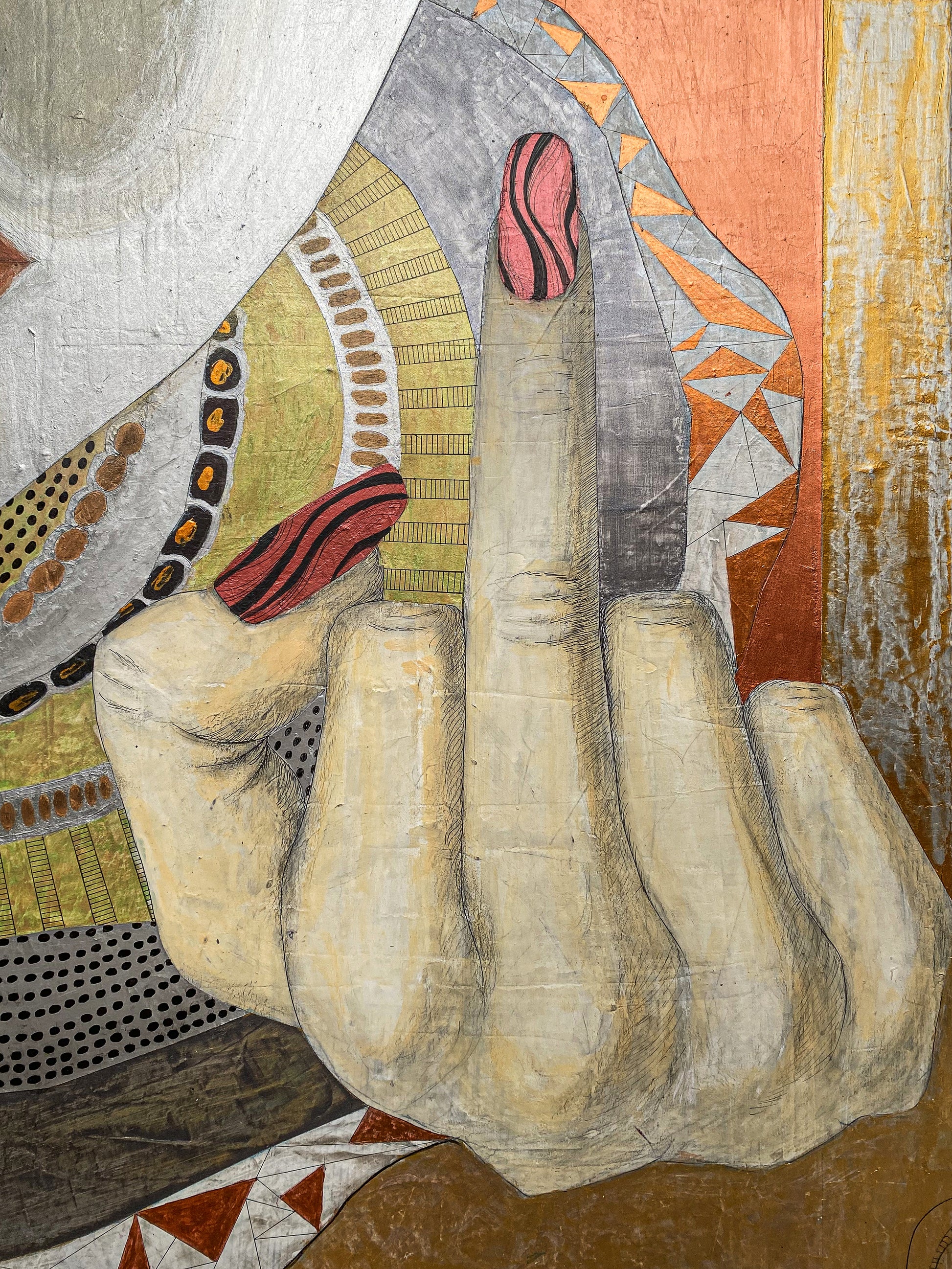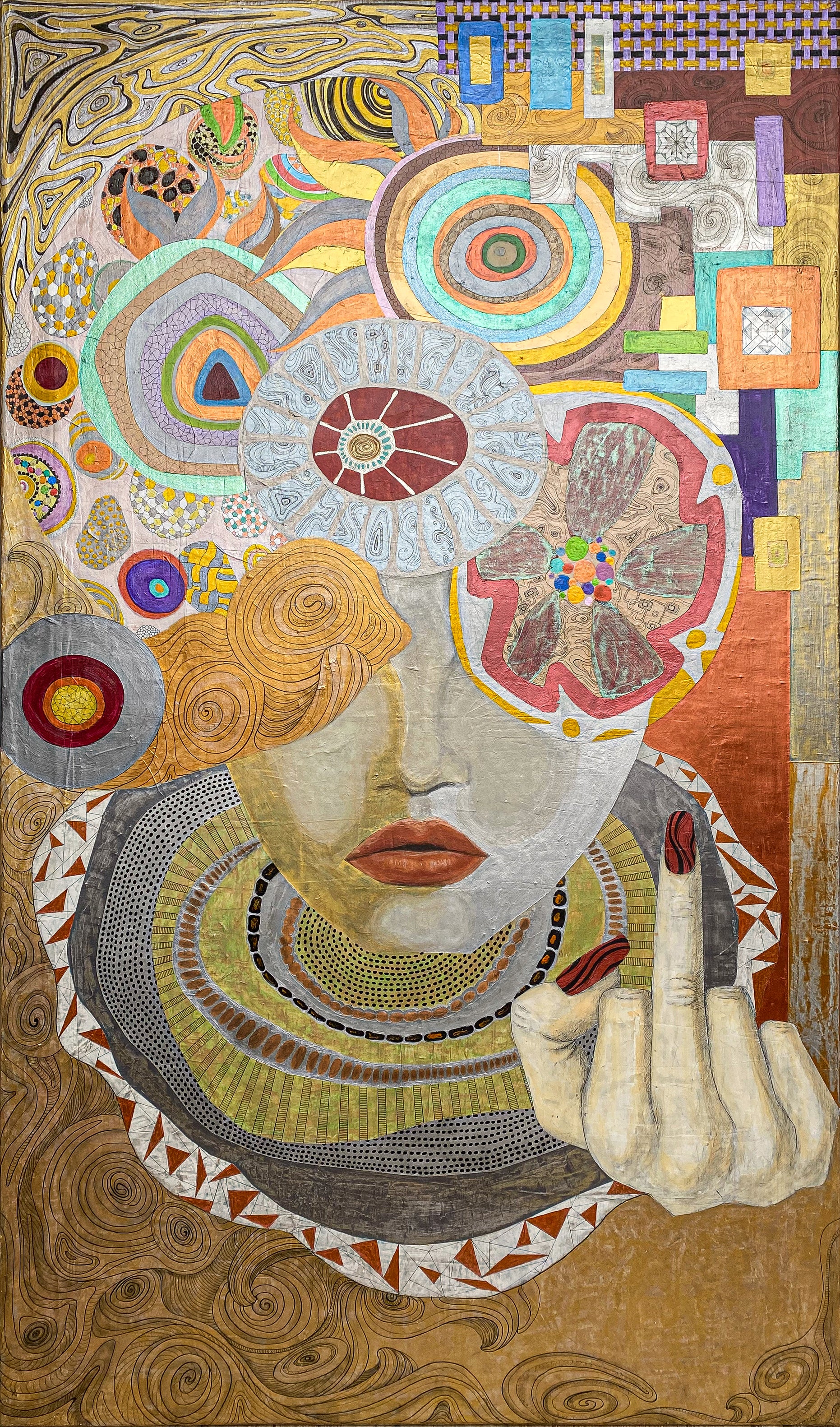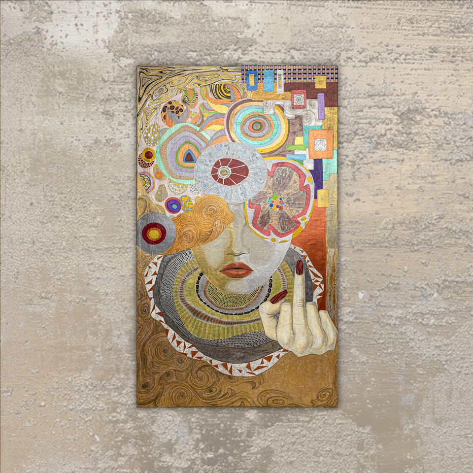 The work stages a paradox: a vibrant ledger of passages overlaid by a blunt prohibition sign. In PELLESCURA 1464’s language, the block is not an end—it's a threshold, where structure becomes emotion.Pattern behaves like memory: gathered, repeated, interrupted, and finally sealed into a portrait that feels ceremonial rather than descriptive.Gold and warm mineral tones carry the image forward as if it were an icon—devotion, appetite, restraint—all in one face.