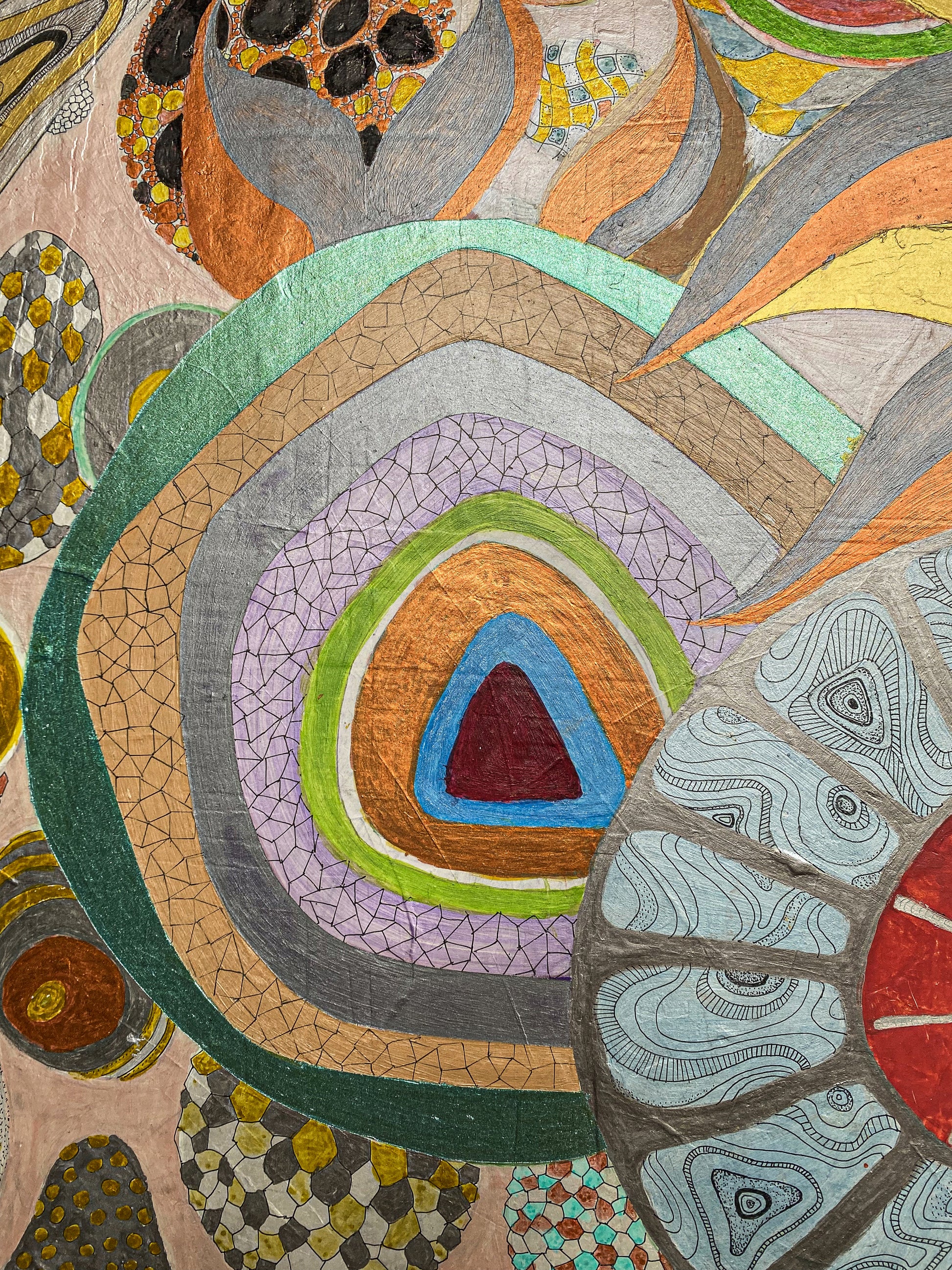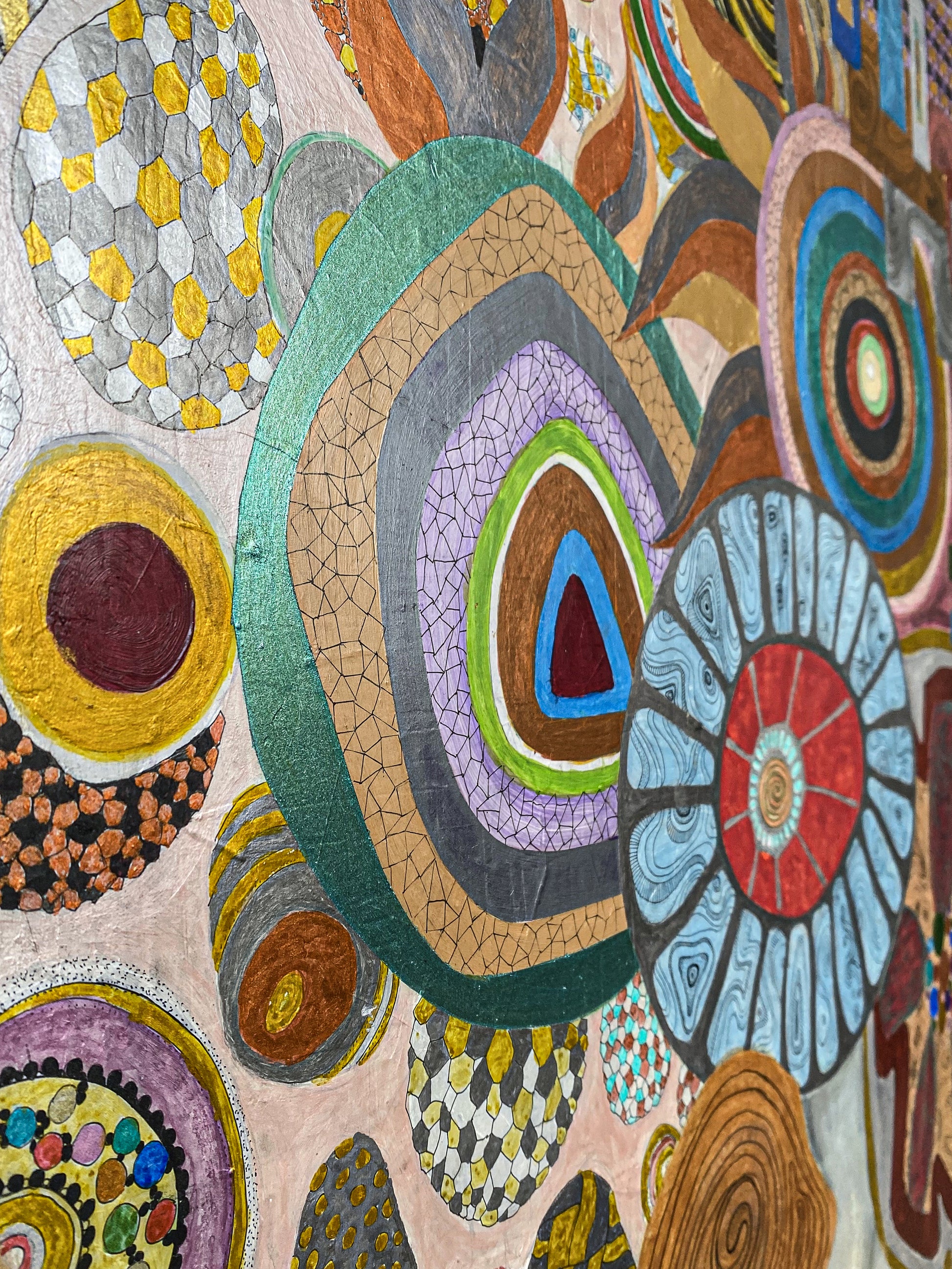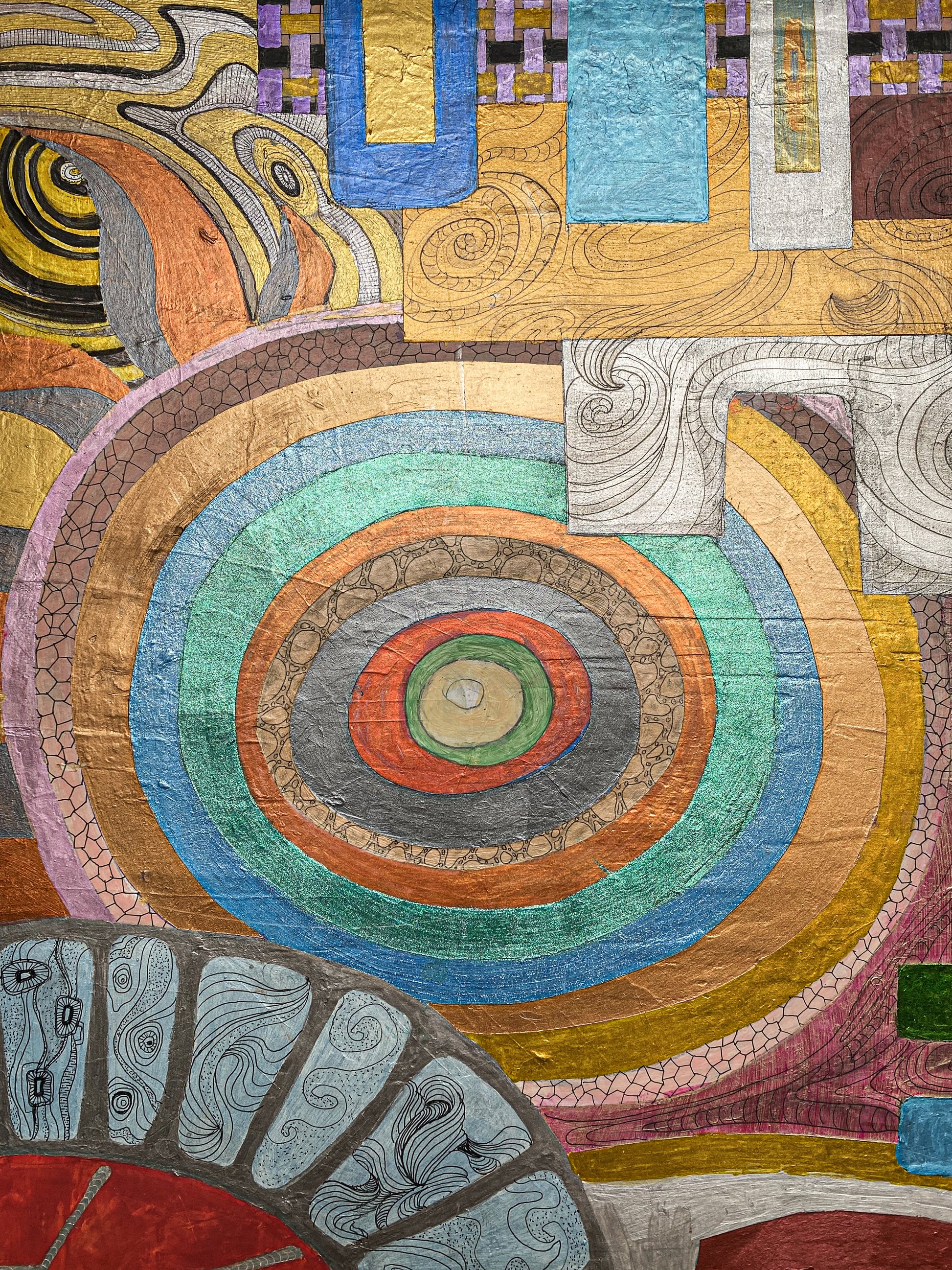 The work stages a paradox: a vibrant ledger of passages overlaid by a blunt prohibition sign. In PELLESCURA 1464’s language, the block is not an end—it's a threshold, where structure becomes emotion.Pattern behaves like memory: gathered, repeated, interrupted, and finally sealed into a portrait that feels ceremonial rather than descriptive.Gold and warm mineral tones carry the image forward as if it were an icon—devotion, appetite, restraint—all in one face.